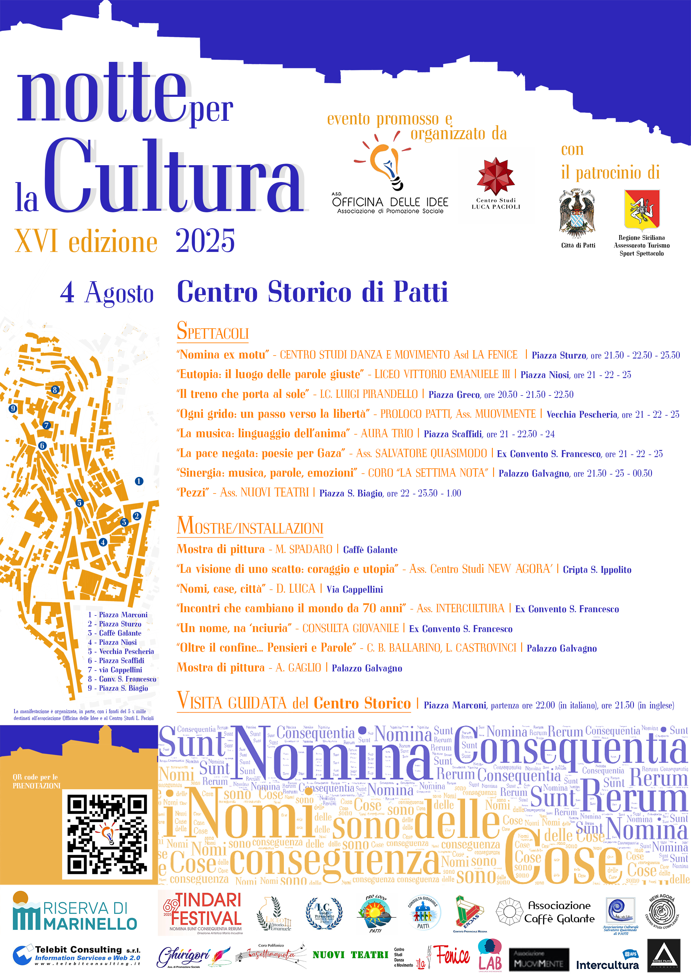 Giunta alla sua sedicesima edizione, Notte per la Cultura è dedicata alla scoperta e alla promozione del Centro Storico di Patti. L'evento, organizzato dall'Associazione Officina delle Idee con il sostegno della Città di Patti e di numerose realtà associative ed istituzionali pattesi, propone un ricco programma con visite guidate gratuite istallazioni artistiche e spettacoli.