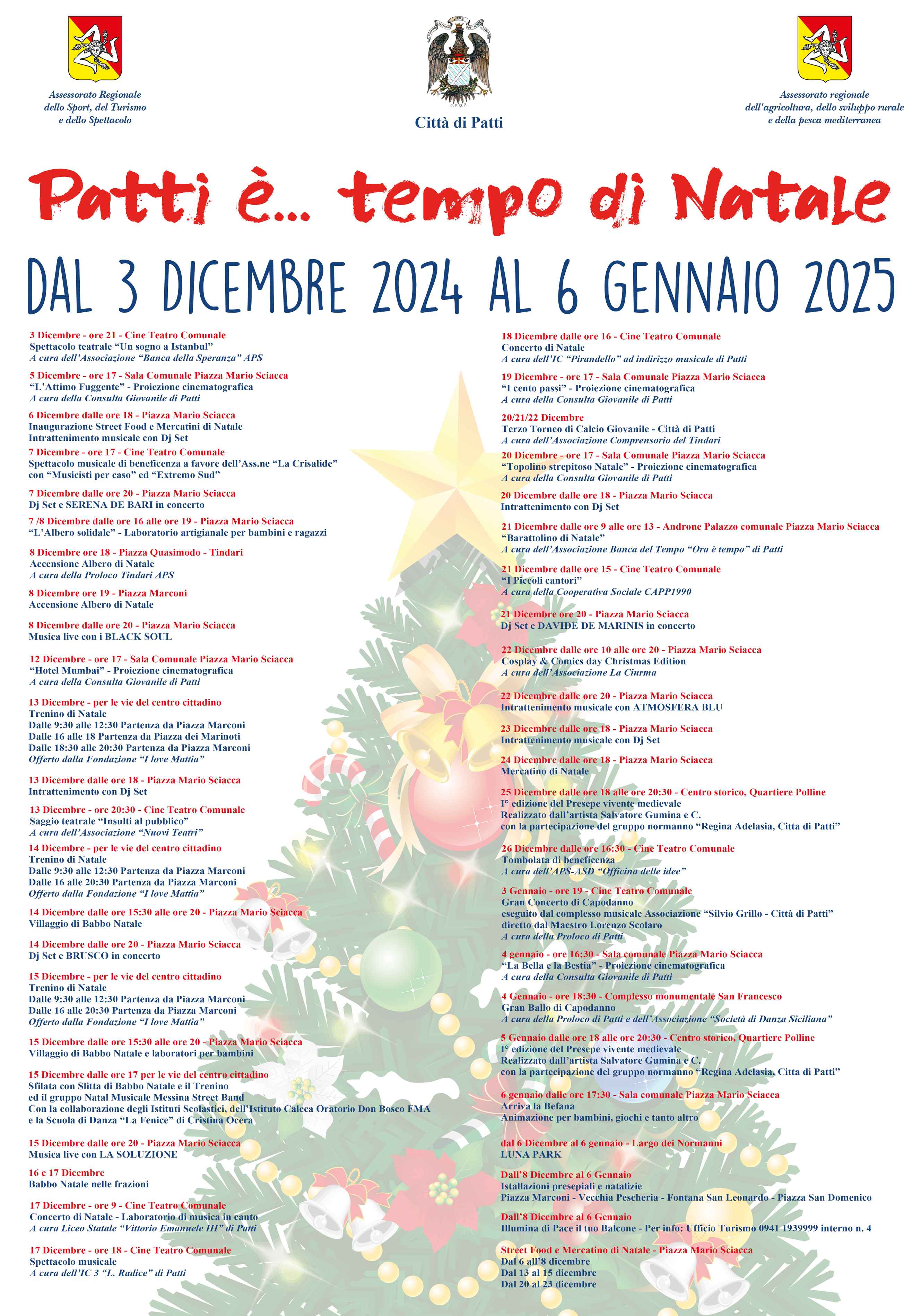 - Dall’8 Dicembre 2024 al 6 Gennaio 2025 – Nell’ambito del Programma “Patti di Pace – Natale 2024” - 2ª Edizione del Concorso “Illumina di Pace il tuo Balcone” (per info – Ufficio Turismo tel. 0941/1939999 – Int. n. 4)